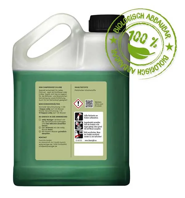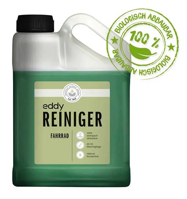 Mache Fahrrad putzen zum Vergnügen! Der eddy Fahrradreiniger ist der hochkonzentrierte Spezialreiniger, der für jedes Bike entwickelt wurde – egal ob klassischer Drahtesel oder High-Tech E-Bike. Mit nur einer 1-Liter-Flasche Konzentrat erhältst du mehr als 11 Liter gebrauchsfertigen Fahrradreiniger – ein echtes Schnäppchen, das auch Plastikmüll reduziert!